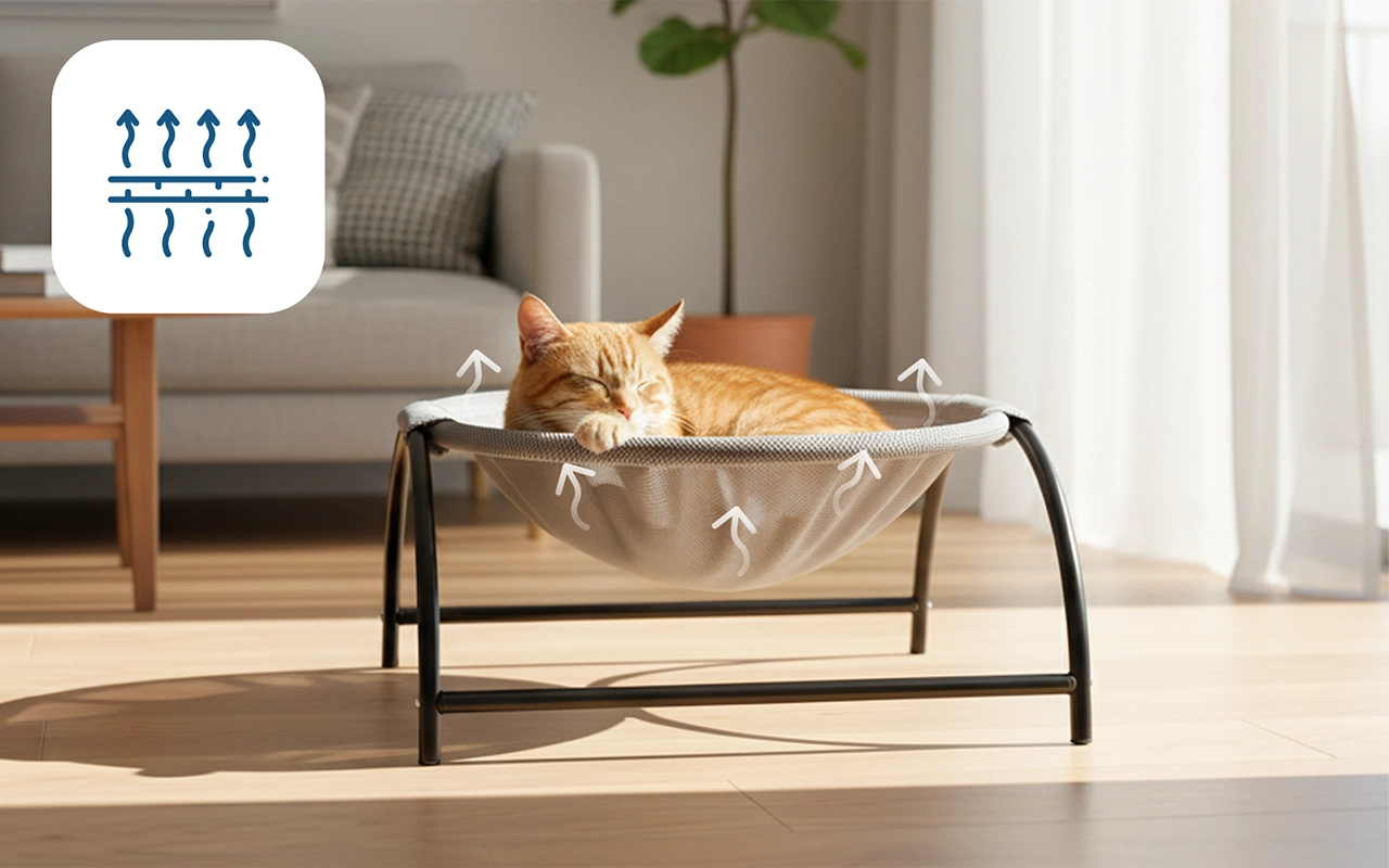 Síťovaný design umožňuje proudění vzduchu a zabraňuje hromadění tepla. Kočky zůstávají v klidu i během teplých dnů uvnitř.