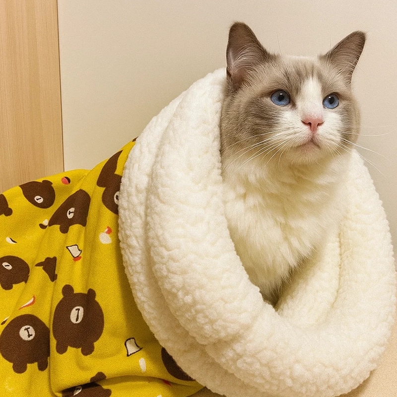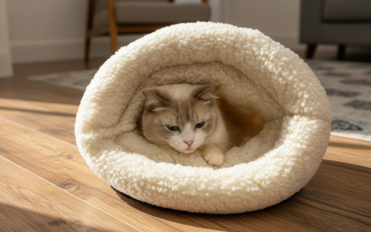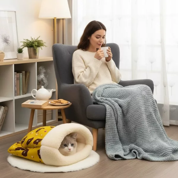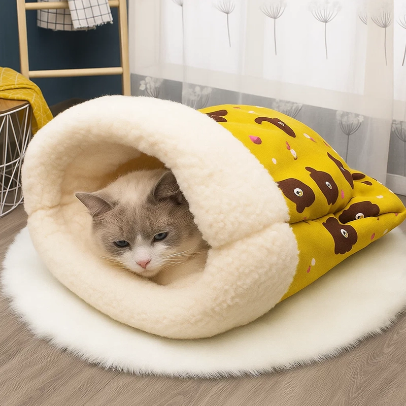 Roztomilý plyšový spací pelíšek pro kočky s uzavřeným designem