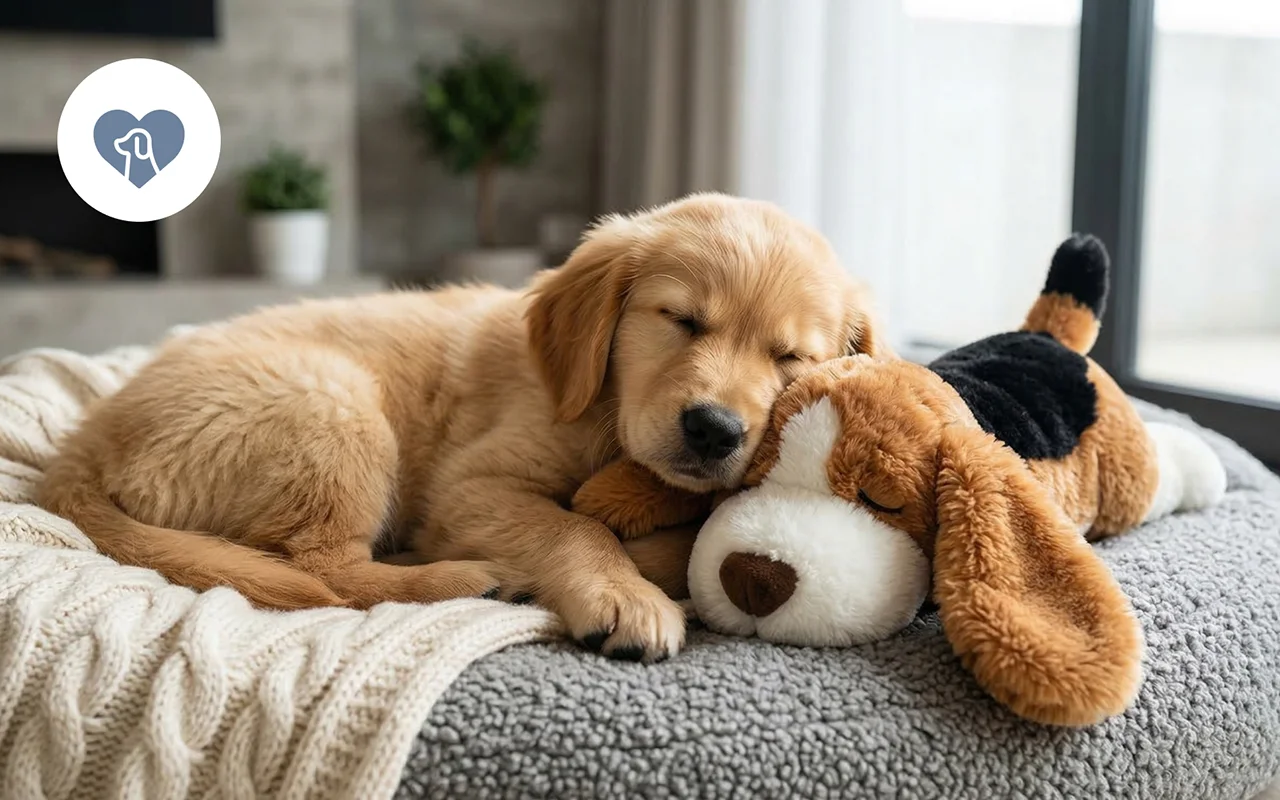 Uklidňující plyšák se srdíčkem; náš mladý pes teď spí déle.