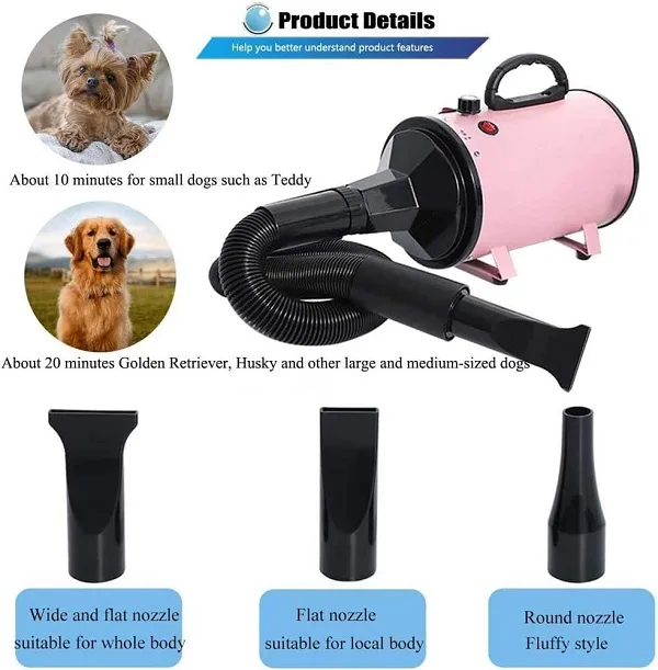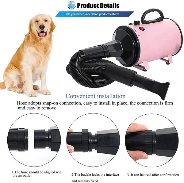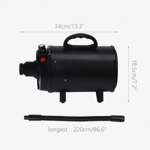 Tento fén na psí srst má vyměnitelné nástavce a flexibilní hadici dlouhou 2,1 metru. Můžete tak mít veškerou flexibilitu, kterou potřebujete k dokonalé úpravě! Fén se pyšní nízkou hlučností, protože je vybaven funkcí snižování hluku, aby váš pes zůstal klidný během sušení. Je dostupný v několika barvách: černé, růžové, modré, bílé a žluté. Navíc je fén snadno instalovatelný pro pohodlné použití přímo u vás doma!