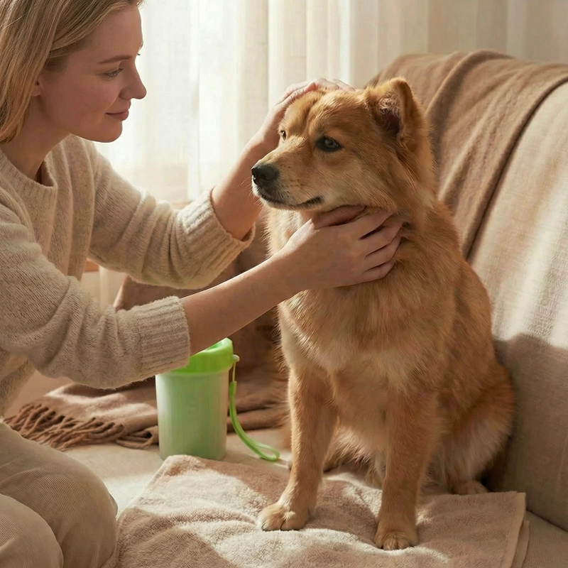 Už žádné otisky tlapek na gauči! Tento malý kelímek se snadno přenáší a po výletě v přírodě šetrně očistí mého pejska.