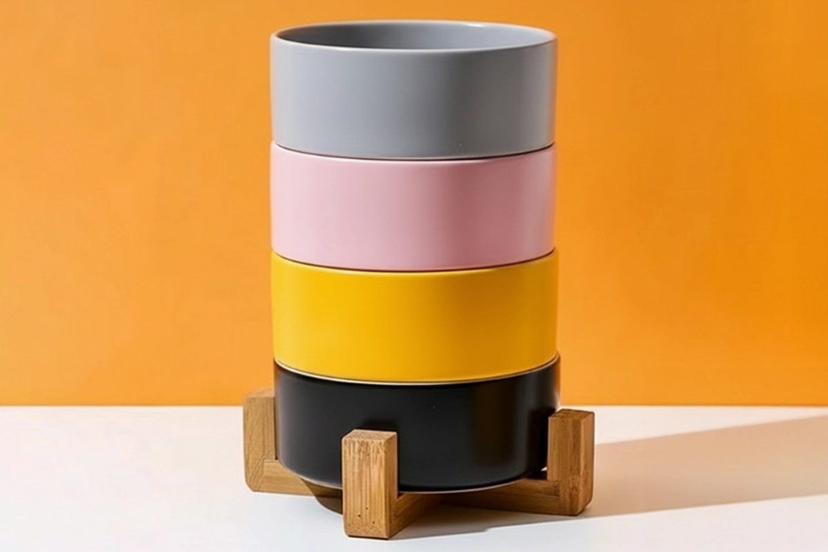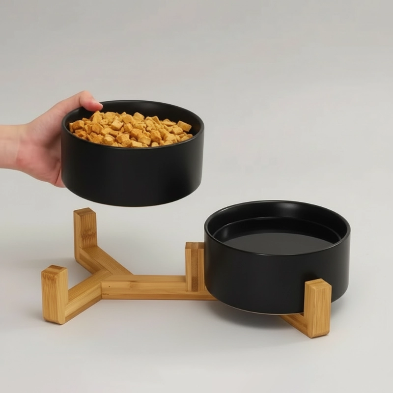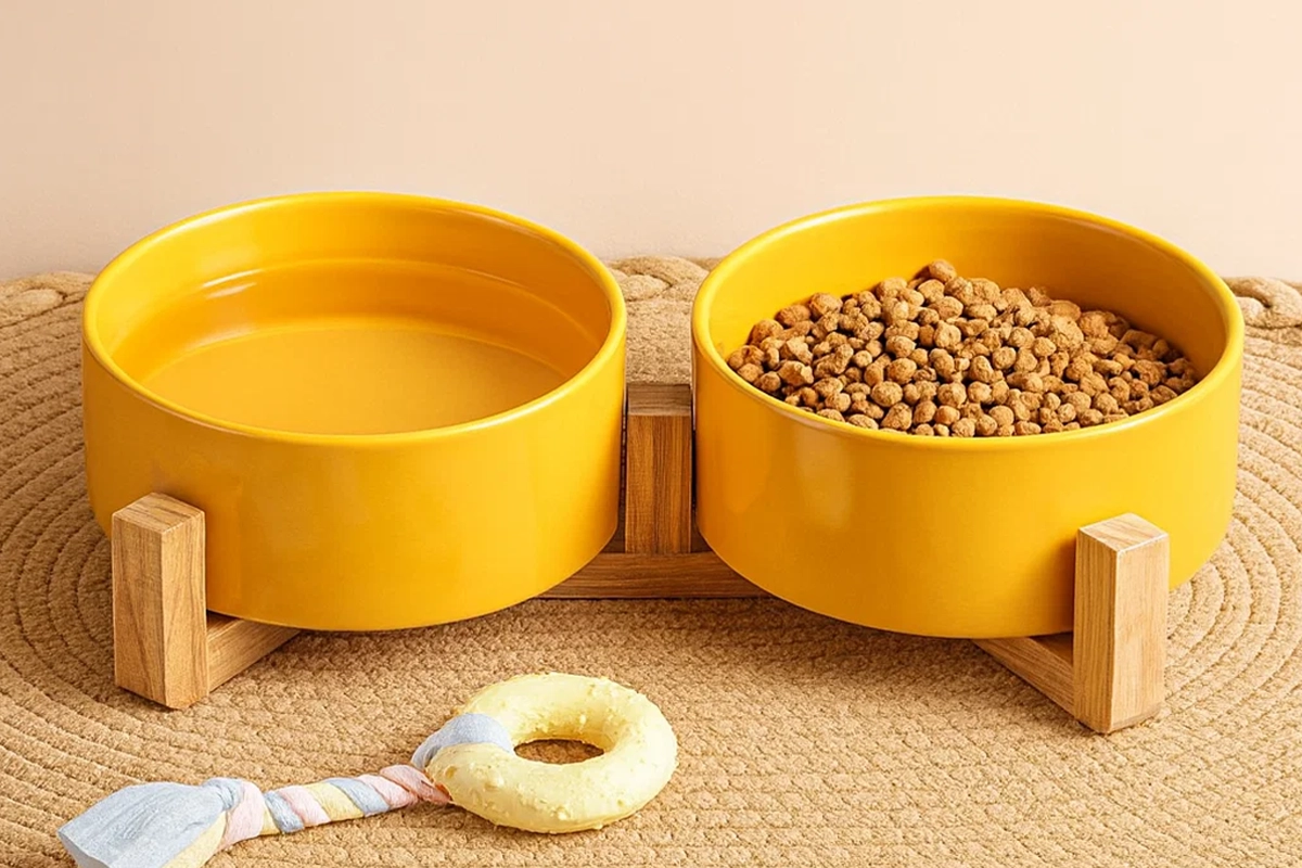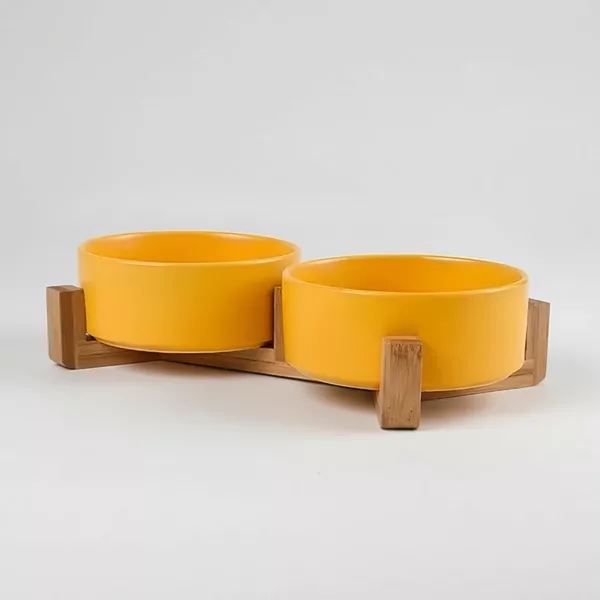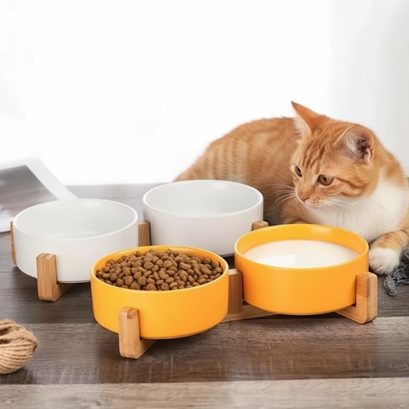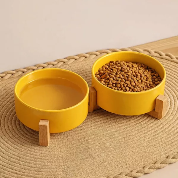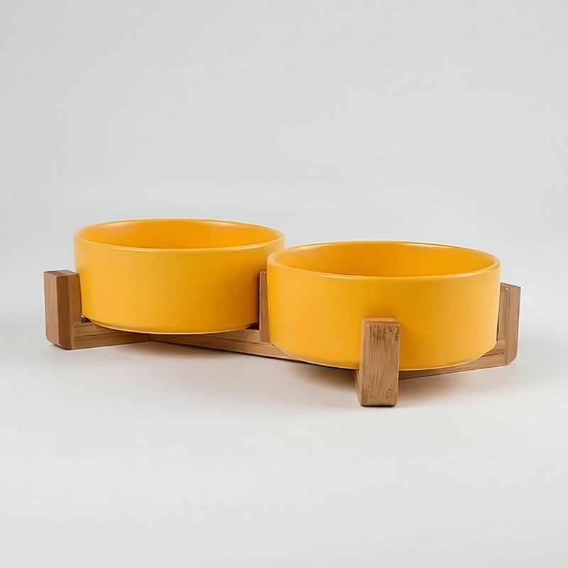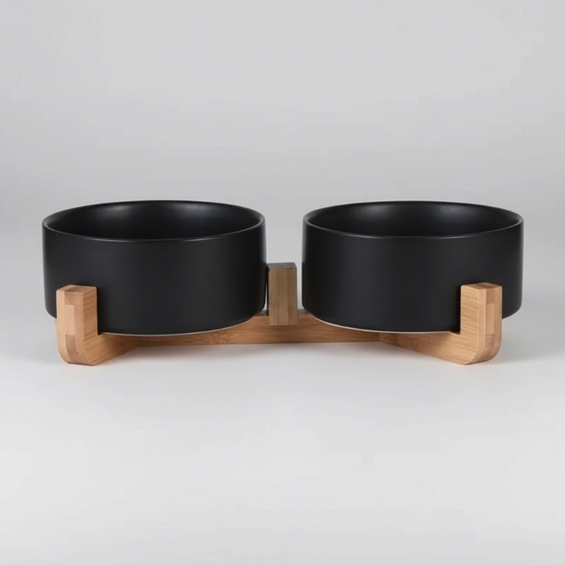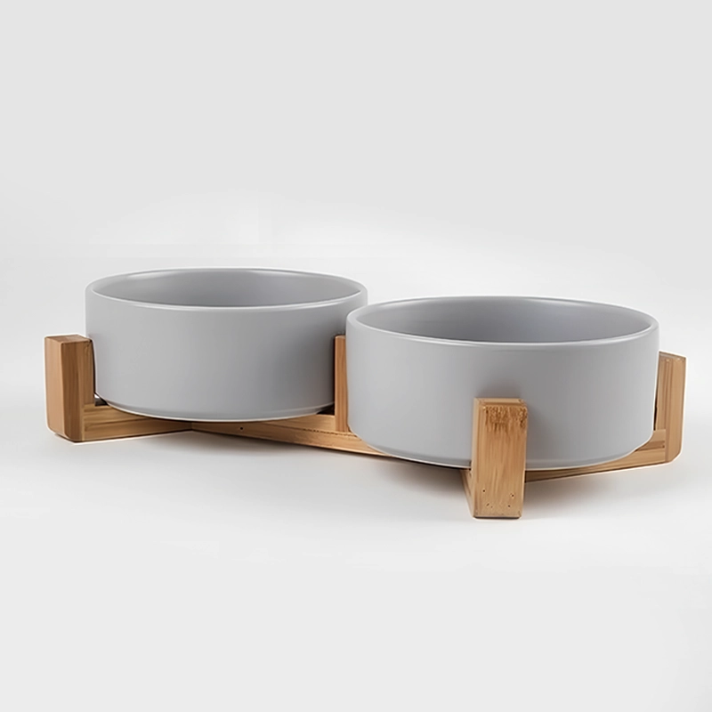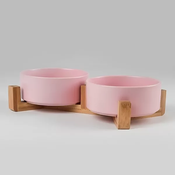 Dvojitá keramická miska pro domácí mazlíčky se stojanem ze dřeva