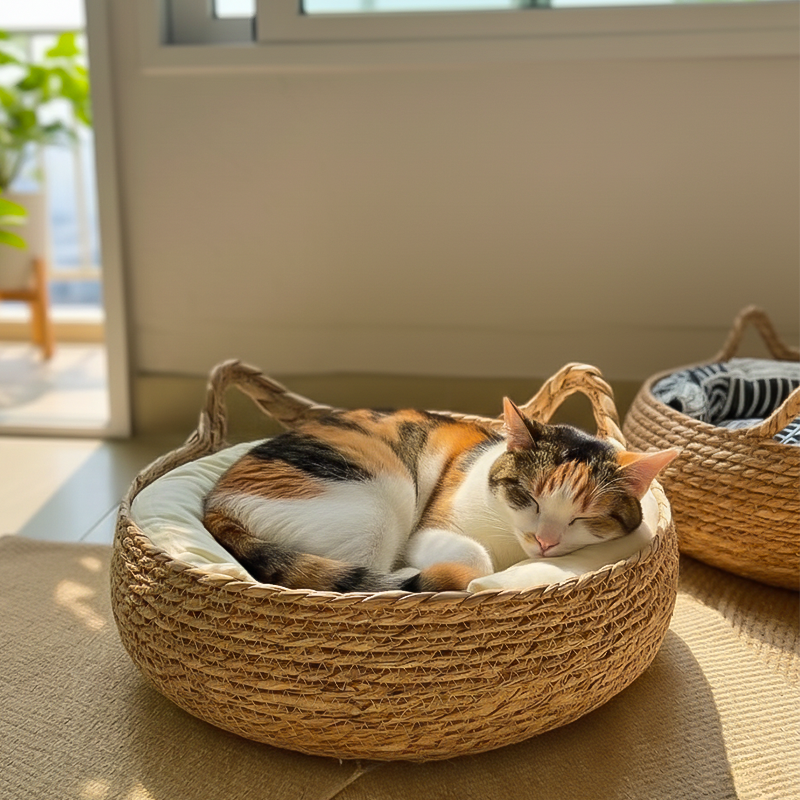 Skvělý malý úkryt! Měkký polštářek a přírodní košík dávají mojí kočce pocit bezpečí a jednoduše se udržuje svěží.