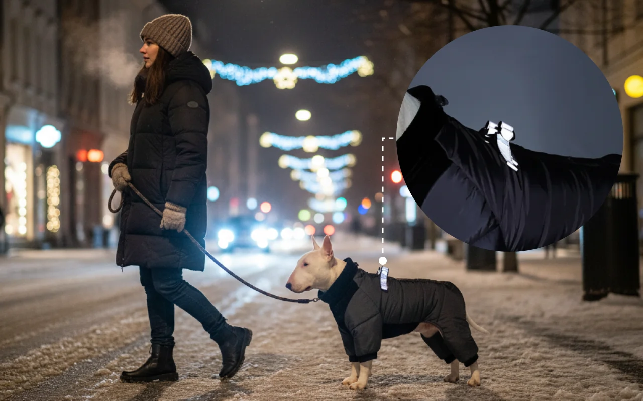 Můj pes miluje svůj nový zimní kabát. Udržuje ho v teple a lesklé proužky mi dávají větší pocit bezpečí při nočních procházkách.